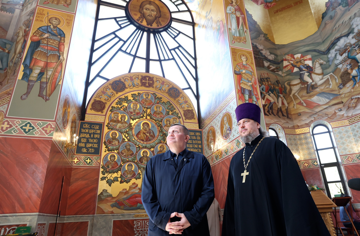 Губернатор Волгоградской области осмотрел обновленный храм на главной высоте России в Волгограде и пообщался с настоятелем. Тончайшая работа мастеров была высоко оценена. Продолжается благоустройство прилегающей к церкви территории. Фото: администрация Волгоградской области Работы по росписи в храме Всех Святых в Волгограде завершены. Андрей Бочаров высоко оценил работу мастеров. Напомним, что реконструкция началась осенью прошлого года. За это время здесь установили систему отопления и выполнили роспись стен. Искусную работу на протяжении полугода проводили иконописцы Палехской мастерской под руководством Алексея Аверина. Площадь «полотна» составила 1,7 тысячи квадратных метров. В ярких образах художники смогли отразить ключевые исторические события, в которых решалась судьба Отечества, сообщили в администрации региона. В ходе рабочей поездки губернатора Волгоградской области были рассмотрены вопросы благоустройства прилегающей территории. У храма уже отремонтированы подъездные пути,