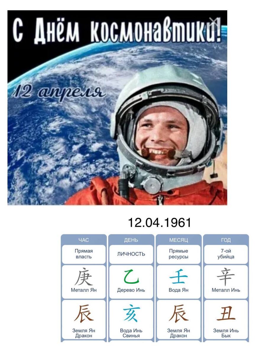 С днём космонавтики, дорогие мои! Конечно, сегодня мы не можем не вспомнить Юрия Гагарина, благодаря которому этот день стал праздником :). Про Юрия уже многое сказано. Но я бы хотела зайти со стороны его личностных качеств, которые позволили совершить этот полет успешно. 1. Здоровье. Без тренированного тела и изначальных данных от рождения Юрий не смог бы быть допущен к полету. Его дата рождения - это тот самый "сильный день", который мы бы отметили значком "домик" в нашем калькуляторе, если бы это был бы текущий день и рекомендовали бы в такой день восстанавливать отношения, посещать врача, делать плановые операции и так далее. Человек, родившийся в такой день, изначально имеет сильное тело и способности переносить разного рода нагрузки: много работать и заниматься спортом. 2. Способность быстро думать и решительность. За это отвечают сразу два параметра в карте Юрия, причем, оба очень благоприятные: сильная структура Непрямой Власти (дерево Инь) и Непрямые ресурсы (огонь Инь). Огонь