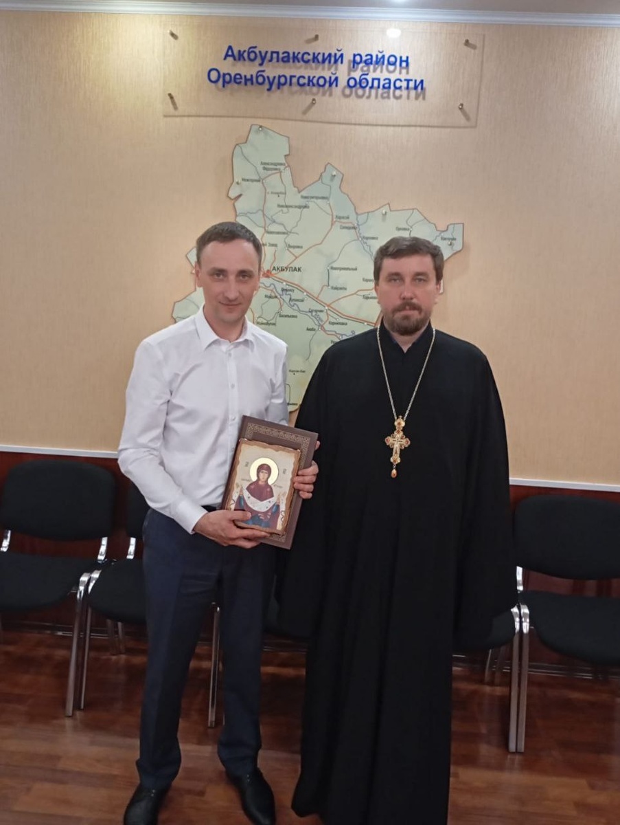 Священник благословил главу района Настоятель храма Покрова Пресвятой Богородицы поселка Акбулак священник Вадим Татусь встретился с новым Главой Акбулакского района Сергеем Владимировичем Вязовиком. Встреча прошла в рабочем кабинете у Главы администрации муниципального образования «Акбулакский район». Священник Вадим Татусь благословил Сергея Владимировича, вступившего на должность главы района иконой Покрова Пресвятой Богородицы, подарил книгу "Православные исторические храмы Оренбуржья" и сказал напутственные слова: "Вступив в должность Главы района, Вы, уважаемый Сергей Владимирович, вступили на путь ответственного служения нашему Акбулакскому обществу. Выполняя непосредственно свои основные должностные обязанности и представляя наш район в вопросах взаимодействия с органами государственной власти, с органами местного самоуправления других муниципальных образований, с гражданами и организациями, в том числе с местными религиозными организациями включая православие и ислам, помни
