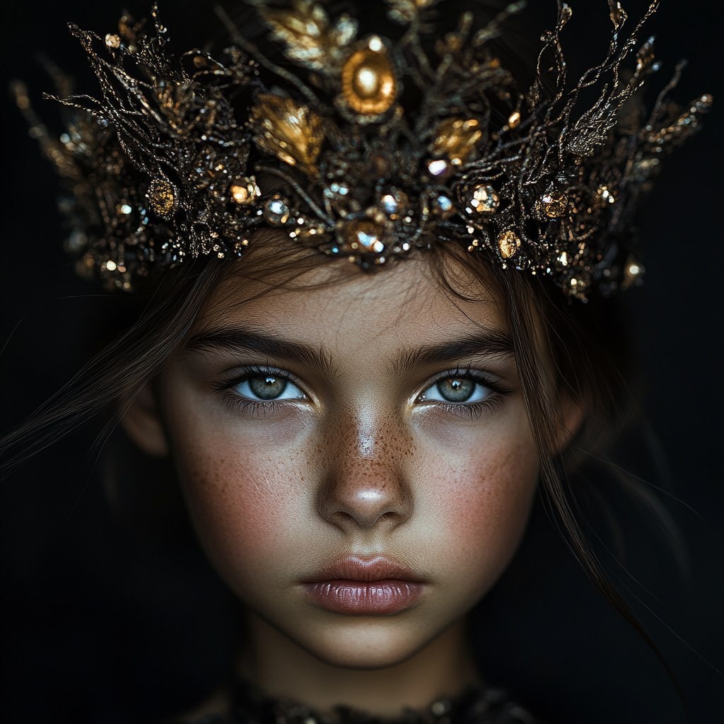 Создано на основе запроса: the face of a young girl, dramatic lightning, serious looks in her eye. She wear a fantastic crown with jewels and organic matter like roots. Dark or black background