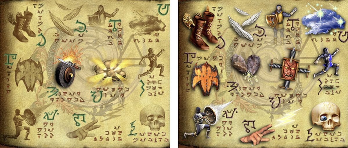 Например, заклинание Искры изображало два точильных камня, выбивающие искры. Честно говоря, с эстетической точки зрения иконка выглядит невзрачно, хотя логика здесь прослеживается.