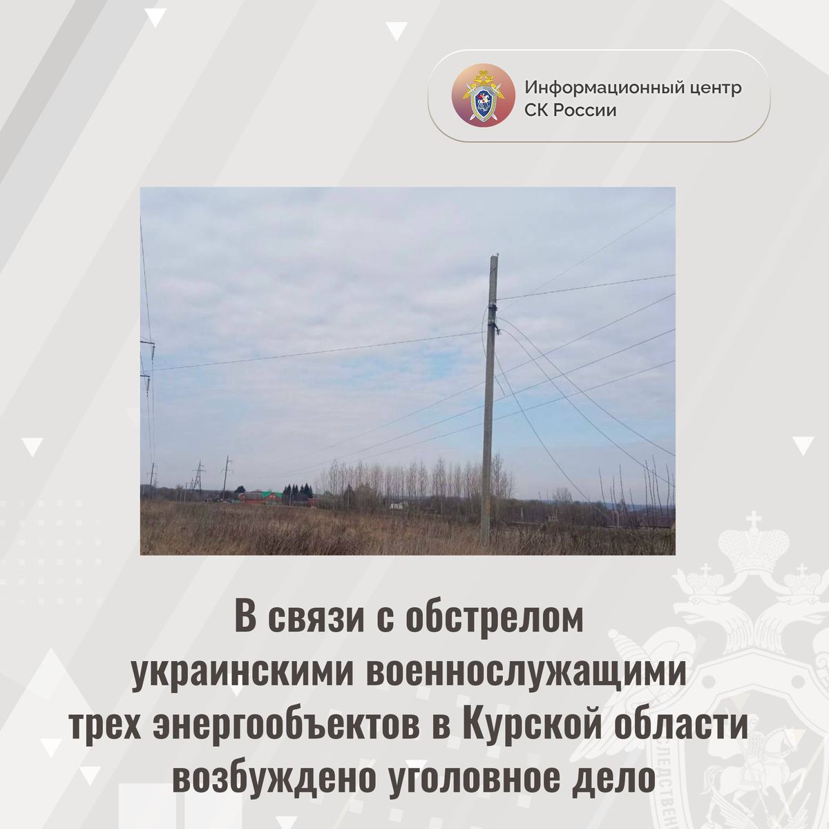 В связи с обстрелом украинскими военнослужащими трех энергообъектов в Курской области возбуждено уголовное дело