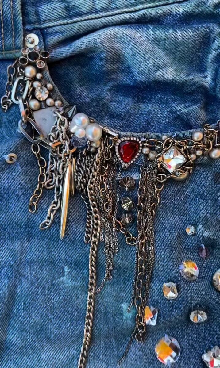 Давайте посмотрим на один из свежих апсайкл-трендов! Всё просто в исполнении: пришиваем к дениму всё, что найдёте — бусины, цепочки, камни и блестяшки всех мастей. Хочешь попробовать? Приходи на мой апсайкл-класс в это воскресенье. Запись тут