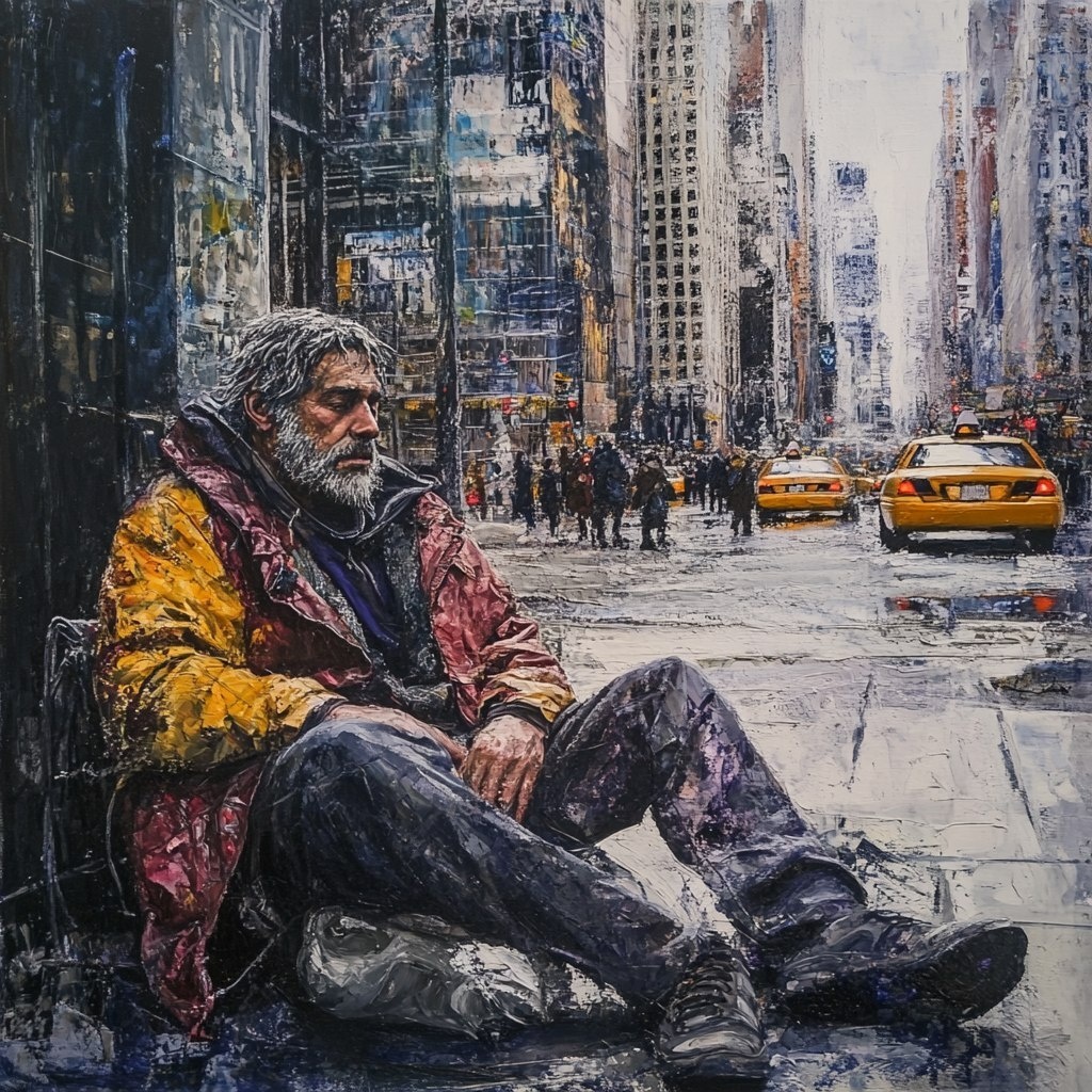 Создано на основе запроса: painted picture of a homeless, poor man in New York observing rich people
