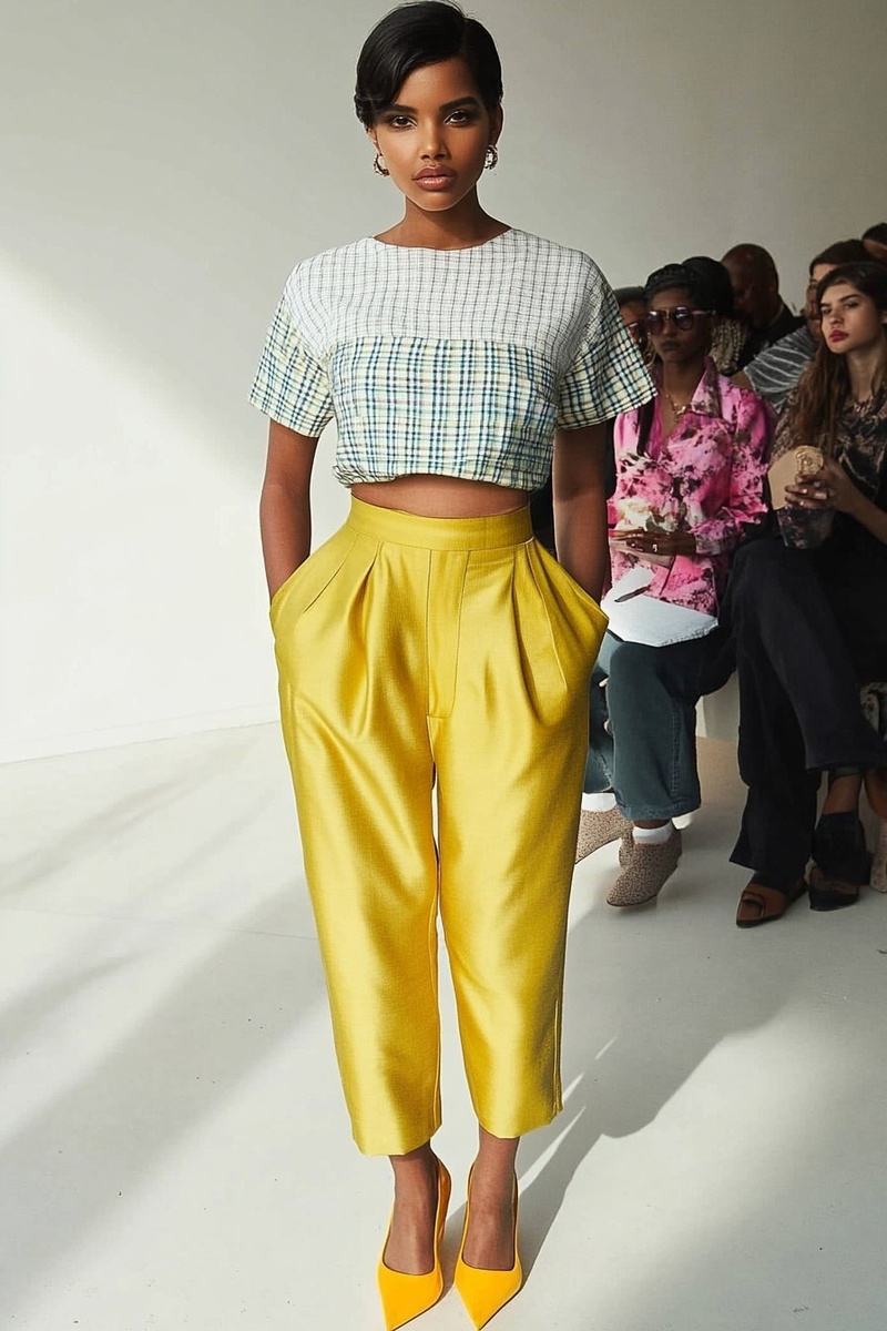 Создано на основе запроса: standing black model wearing citrine yellow green pants, stiff fabric, tomboyish baggy fenminine trousers, , silky fabric, and a checkered white, blue and yellow jersey she has short pixie haircut, light skinned, modern, trendy, white bckground studio shoot --- Автоперевод: стоящая черная модель в цитрин -желтых зеленых штанах, жесткой ткани, мешковатых брюках с фенминином, шелковистой тканью и клетчатой белой, синей и желтой майкой, у нее короткая стрижка пикси, легкая кожа, современная, модная, белая студия Bckground Studio Shootio Как тебе эта иллюстрация? 🤔 https://dzen.ru/id/65c0c65c86e4f837c27b24d7 #ИИ #AI #нейросеть #midjourney #art