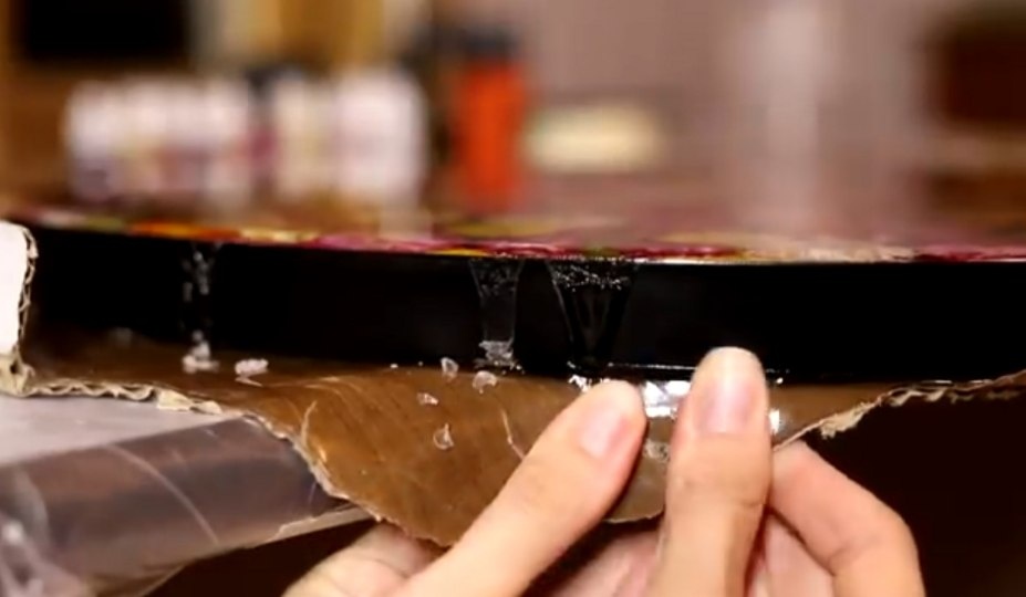 Обклейте заготовку по краю перед заливкой. Если смола начнёт стекать, она останется на скотче. После застывания скотч снимается вместе с подтёками. Лучше использовать скотч средней липкости — он не повредит поверхность.