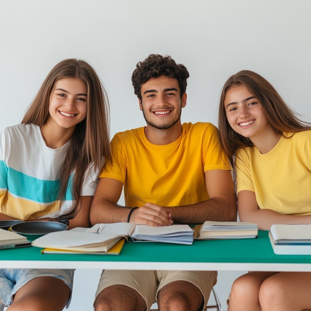 Создано на основе запроса: 2 young woman and a young man armenian nationality sitting around the dasc table on TOEFL classes. There are several flat books and copy books and a pans on the table. There is a minimalistic background classroom with white wall. Students are look happy, they are wearing yellow and turquoise and white T-shorts. Realistic photo