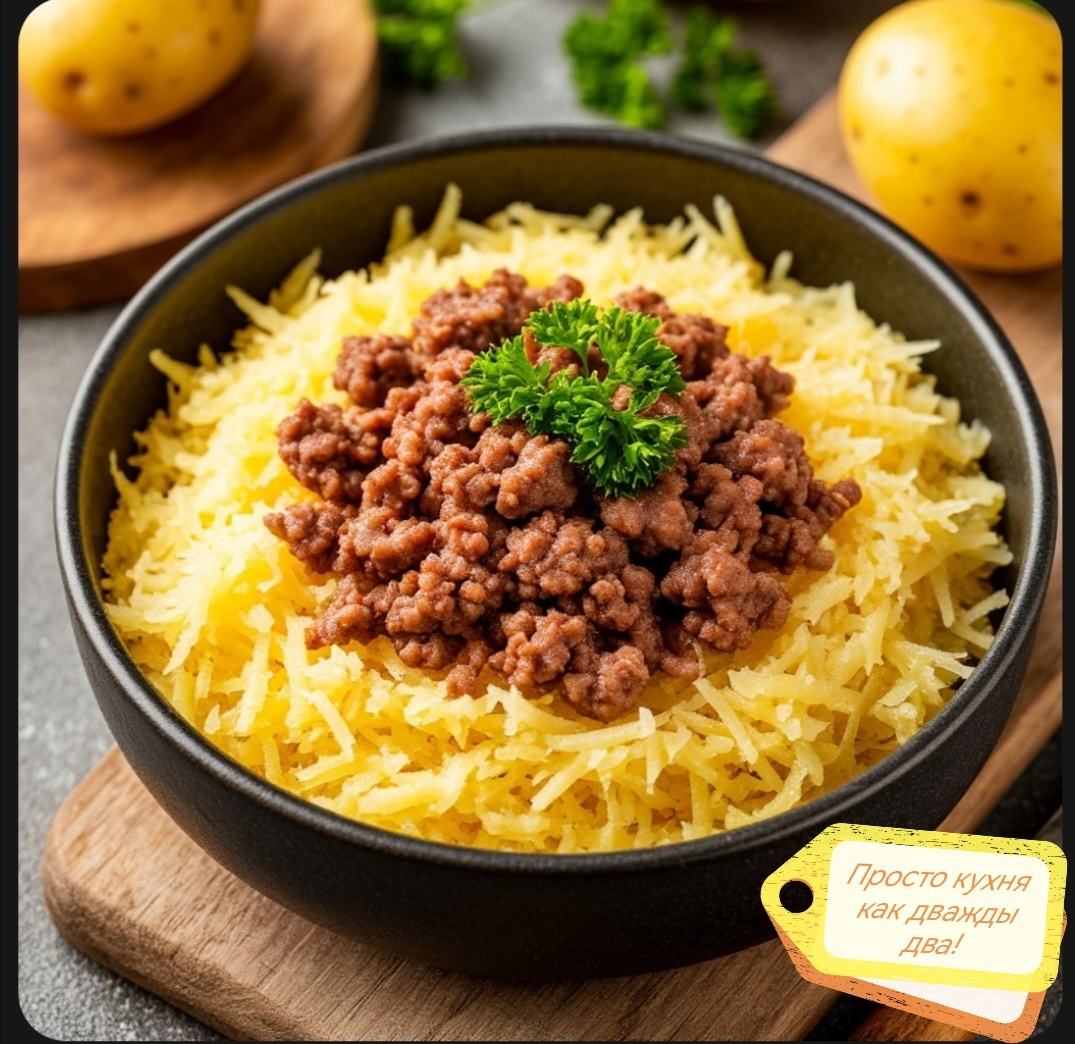 Салат этот придуман давно, наверное как и морковь по-корейски. Но в каждой семье его готовили по-разному! Названия у этого салата тоже очень много, у нас его называли просто - корейский салат! Для приготовления необходимо: -Картофель - 700 грамм -Фарш домашний или говяжий 300-400 грамм. -Соль чайная ложка 5 грамм -Перец чёрный полчайной ложки 2,5 грамма -Растительное масло 50 мл -Сушенная петрушка 5 грамм 1) Для приготовления чистим картофель, хорошо его моем (лучше брать белый картофель с плотной структрурой). Натираем на терке для корейской моркови. Оставляем в тазу, сверху заливаем водой чтобы картофель был светлый и не темнел. 2) Ставим кастрюлю на огонь, даем закипеть, подсаливаем по вкусу. Выкладываем картофель в друшлаг. И отвариваем картофель в течении 5-7 минут, он должен быть по вкусу как альденто плотный не переваренный. Достаём друшлаг, выкладываем в таз даём остыть. 3) Фарш оттаиваем, выкладываем его в хорошо разогретую сковороду, обжариваем до готовности, фарш долже
