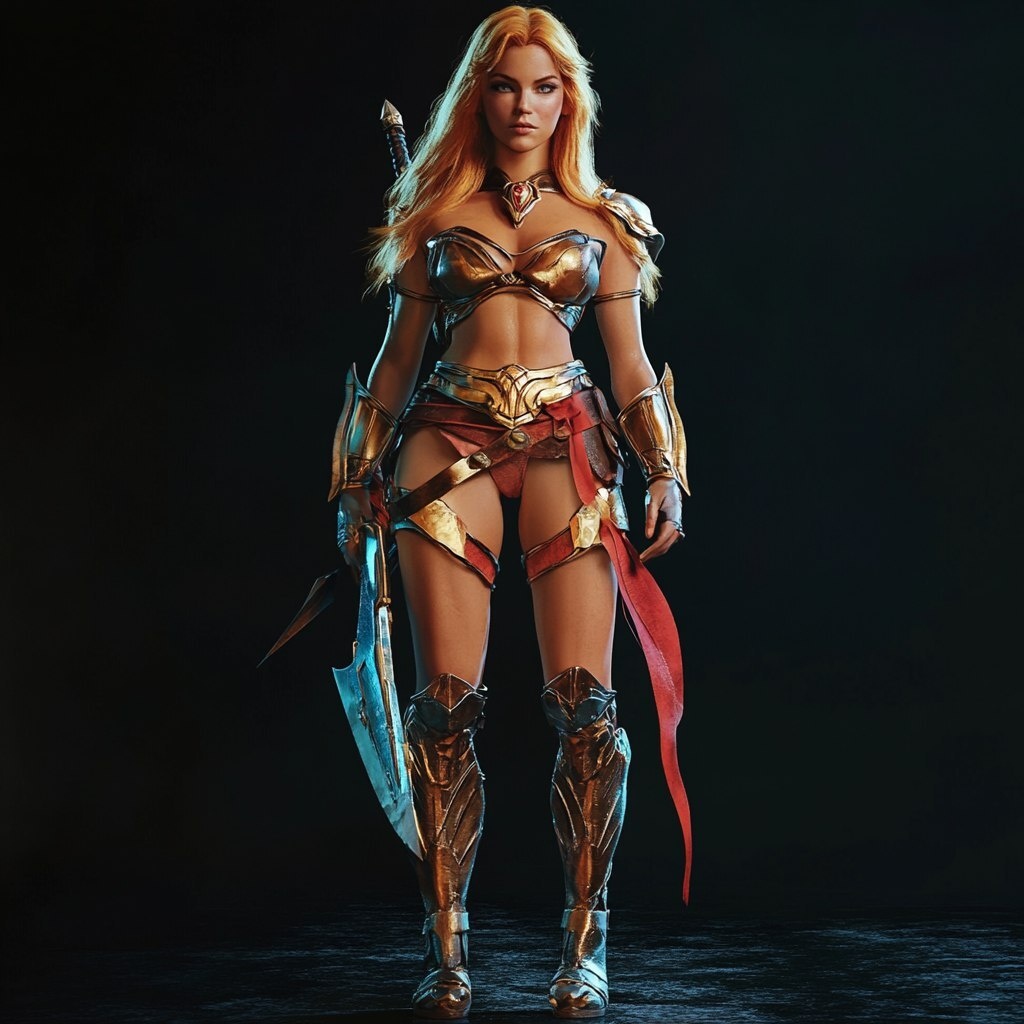 Создано на основе запроса: a realistic full body photo of the video game character tyris flare from golden axe.