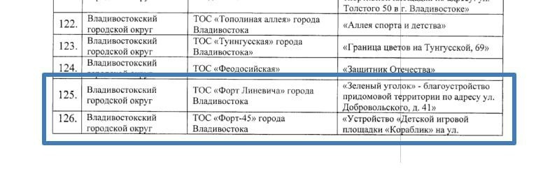 Департамент внутренней политики Приморского края публиковал список проектов ТОСов, чьи заявки допущенных до конкурса. Всего с края поступило 418 проектов, из Владивостока – 87, и 7 из них – с моего округа на Тихой.