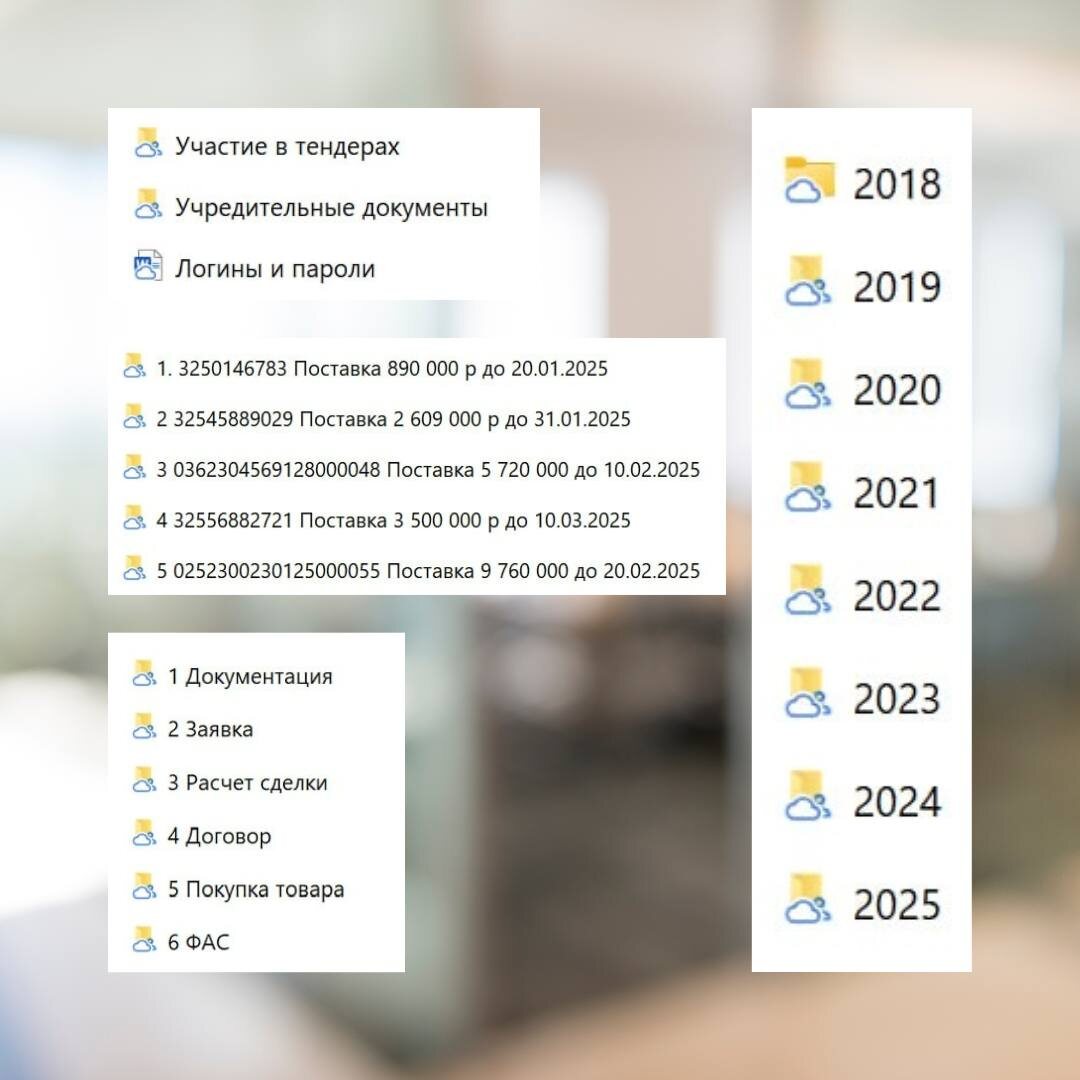 Сегодня поделюсь рутиной, которая помогает мне как руководителю контролировать и вести учет всех сделок и документов. Структурирование документов Уже много лет все мои документы по тендерам собираются по единой структуре. В папке каждой компании есть есть папка с учредительными документами, приказами, решениями, выписками, отчетностью. И отдельно есть папка с тендерами, в которой они разделены по годам. Внутри они пронумерованы, есть данные о процедуре и сроках. 🗂️ Внутри документы по этапам: 1. Документация 2. Заявка (характеристики и документы к заявке, запросы, если есть, протоколы) 3. Расчет (тут файл с расчет по сделке, сначала предварительный, потом итоговый) 4. Контракт или договор (там же гарантии, переписки, закрывающие документы) 5. Покупка товара (внутри договоры, счета, накладные, логистика, если поставщиков много, то у каждого своя папка) 6. ФАС (в случае жалоб) 📑 Так я могу найти любые документы за любой год по любой закупке. Они все корректно названы и всегда в порядке