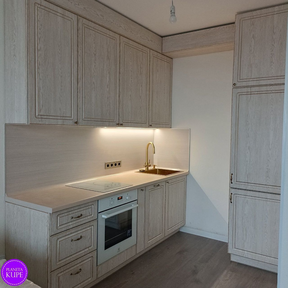 • Фасады: МДФ плёнка «Дуб Мадейра Жемчуг FM 355», фрезеровка «Квадро», патина золото.