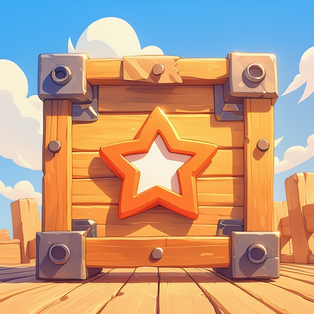 Создано на основе запроса: Wooden box, front view, Brawl Stars game graphic style, game icon, warning leaflet attached to the frame. Front view of the whole thing, low view with the top not clearly visible.