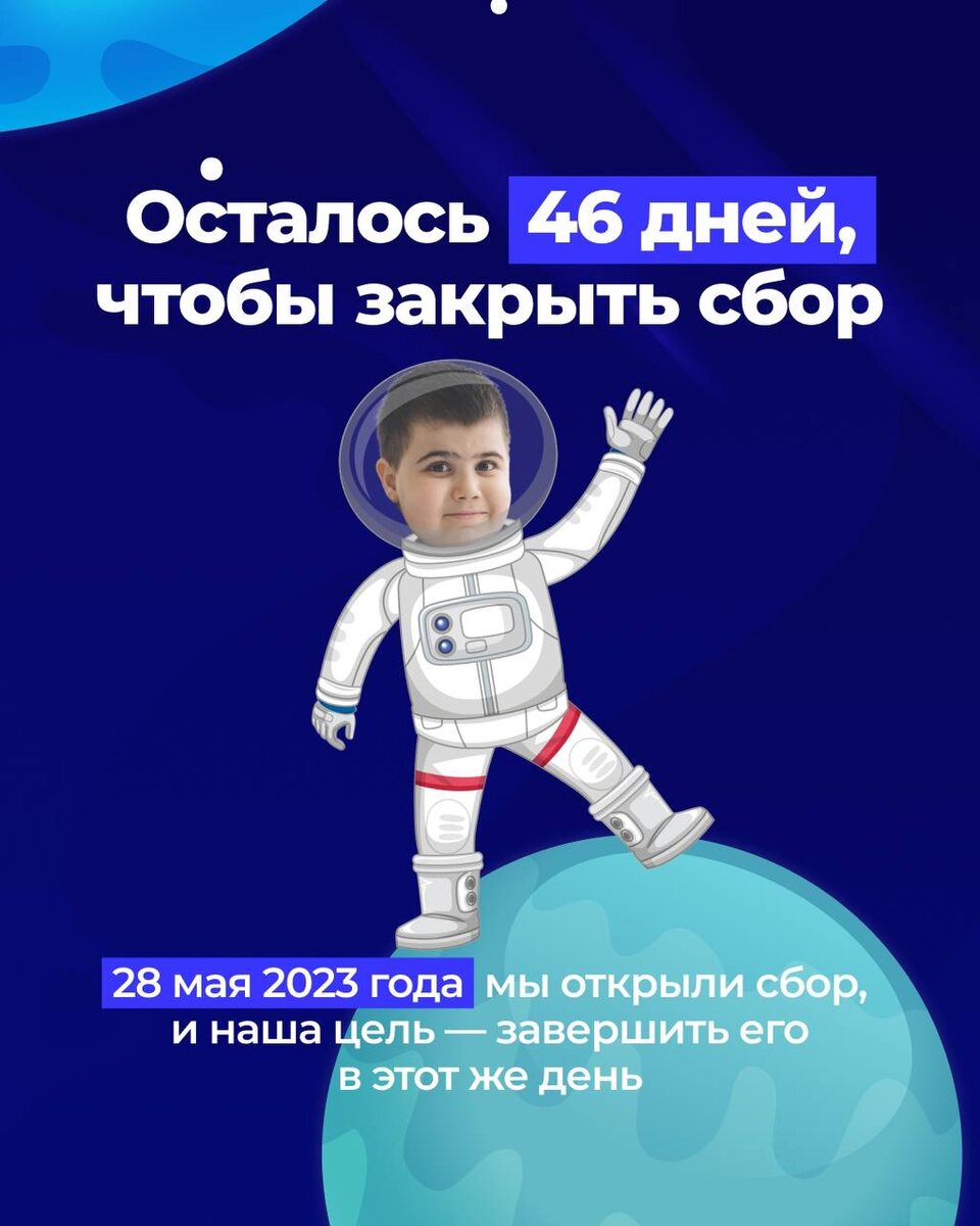 Запускаем акцию «Космо-помощь для Вовы!» Мы поздравляем всех со значимым праздником Днём космонавтики и призываем вас принять участие в акции и приблизить ещё на один шаг Вову к закрытию сбора! 🚀 Любые «космо-суммы» — 12,120,1200 рублей — это шаг к спасению! Присоединись к «КОСМО-ПОМОЩИ» прямо сейчас! ⏳46 дней 👥252 292 человек по 500 руб 🚨 или любая посильная сумма Сейчас на счету каждый день. Вова Соловьев, 8 лет, Диагноз: Миодистрофия Дюшенна. Все документы, фонды и перевод с зарубежных карт по ссылке в описание @savevova2024 Сумма сбора: 262 000 000руб. Осталось собрать: 126 145 803руб. НАМ НУЖНА ПОДДЕРЖКА ЛЮДЕЙ!🙏🏼 Отправьте это видео своему другу, выставите в статусы WhatsApp и телеграмм. Реквизиты: Перевод по номеру тел.+7(918)499-99-81 Заира Масхудовна С. (Мама) СБЕР: 2202 2080 9980 3240 БКС: 2203 6203 2117 2591 В комментариях к платежу: Вове на лечение.
