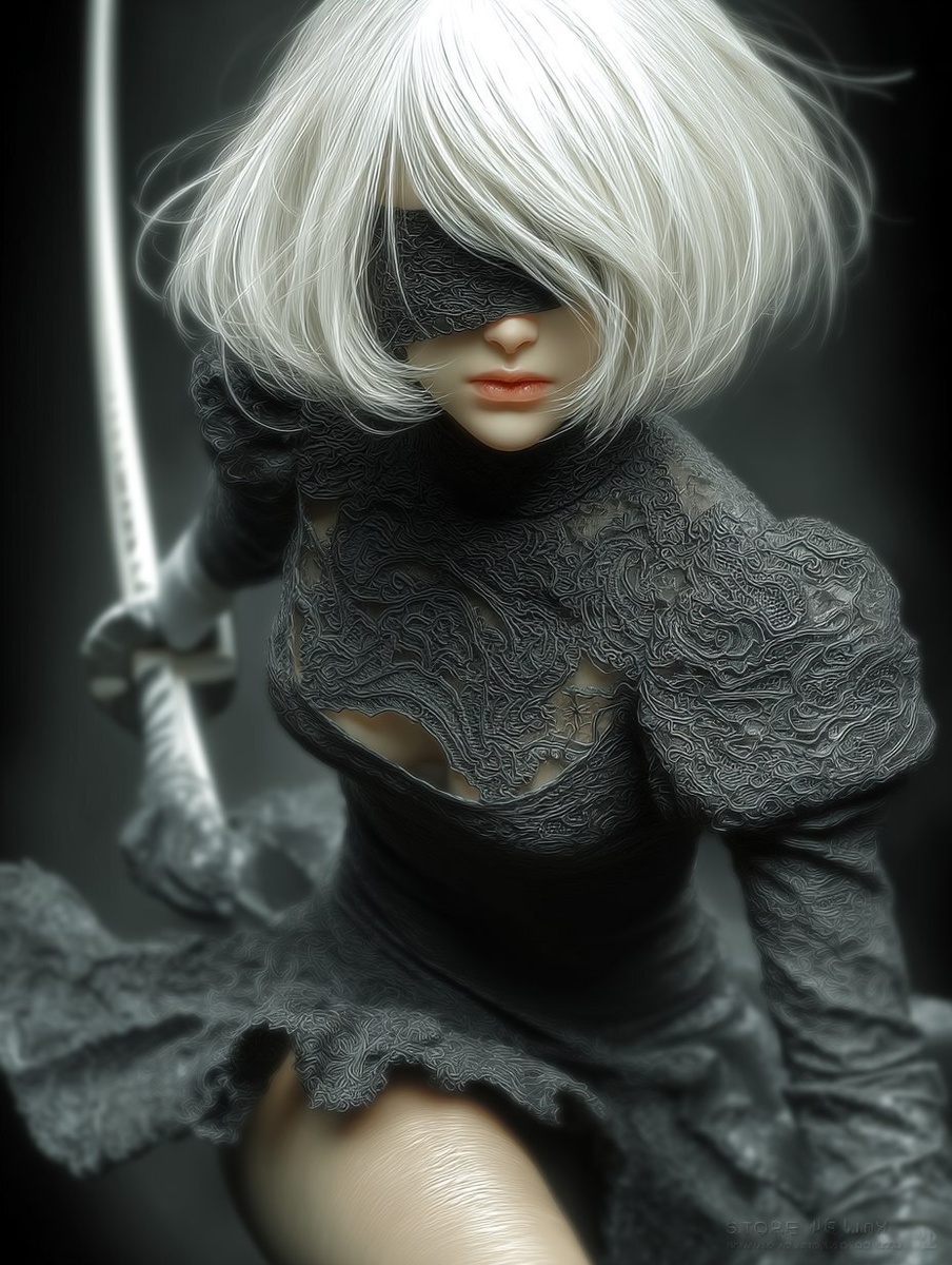 Создано на основе запроса: Nibiru Full body ultra wide angle lens, a girl with short white hair, her eyes covered by black cloth, wearing a tight black lace combat suit, holding a long sword in her hand, fighting in the center of a large square, running with a very long sword in her hand, in a dynamic posture, master piece, high quality.32k