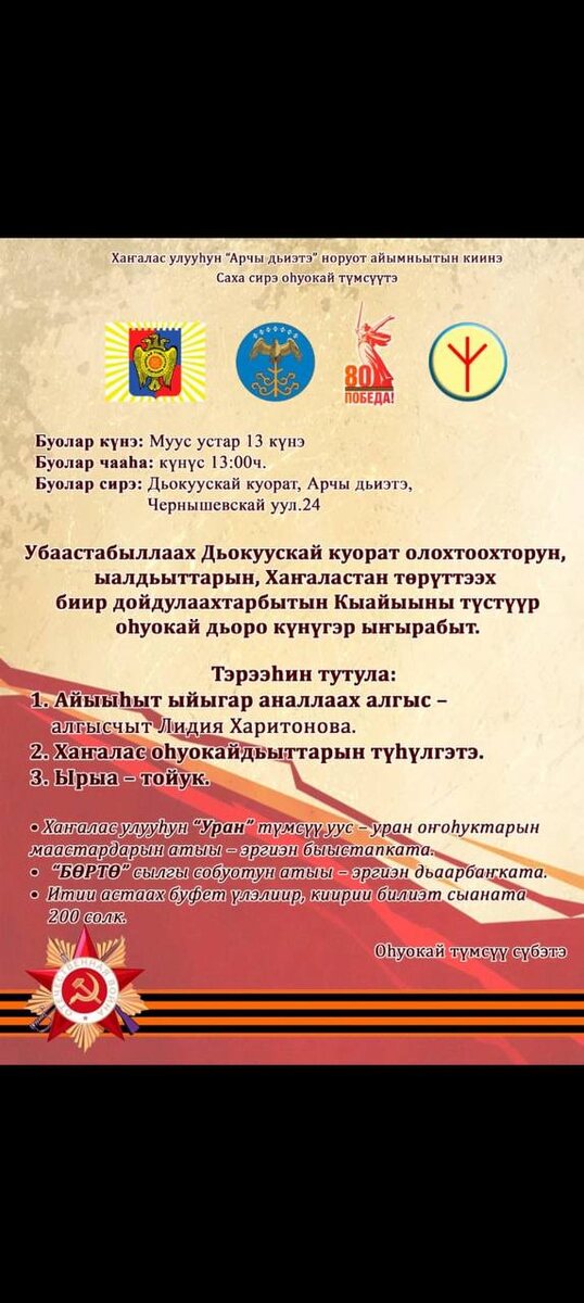 Убаастабыллаах Дьокуускай куорат олохтоохторун, ыалдьыттарын, Хаҥаластан төрүттээх биир дойдулаахтарбытын Кыайыыны түстүүр оһуокай дьоро күнүгэр ыҥырабыт.
