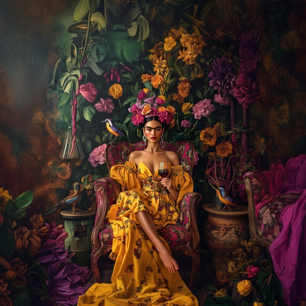Создано на основе запроса: a woman frida kahlo style holding a wine, wearing yellow dress, middle body, sitting in a armchair, realistic image, background flowers and bird gucci style, fashion campaign --- Автоперевод: Женщина в стиле Фрида Кало с вином, в желтом платье, среднем теле, сидящей в кресле, реалистичном изображении, фоновых цветах и стиле птиц Gucci, модной кампании Классно получилось? 🤔 https://dzen.ru/id/65c0c65c86e4f837c27b24d7 #ИИ #AI #нейросеть #midjourney #art