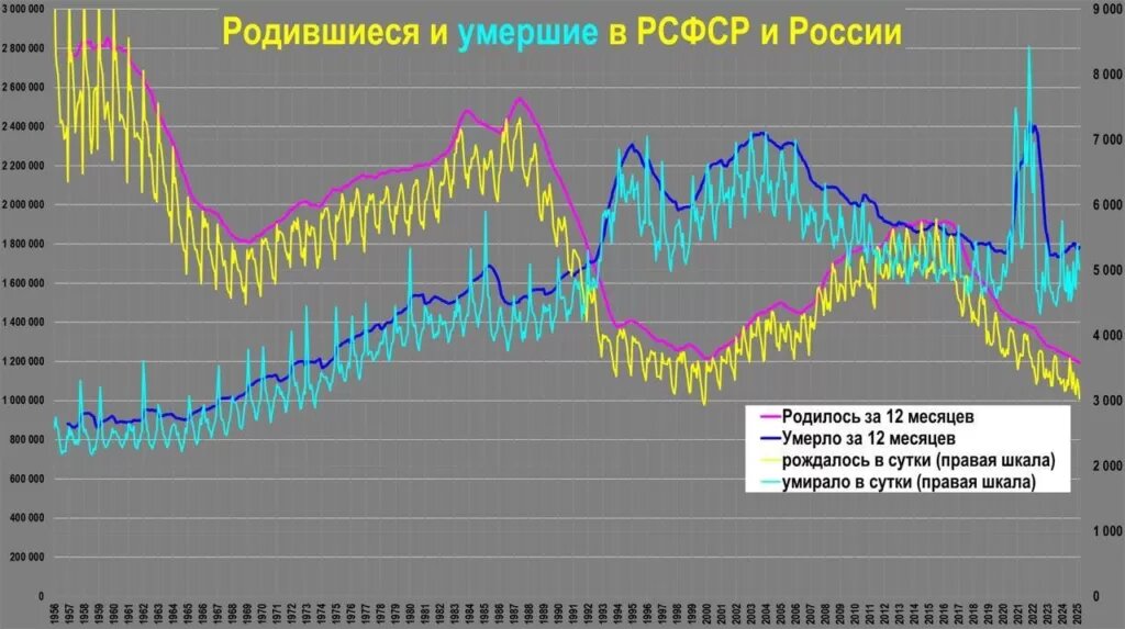 В I квартале 2025 года рождаемость в России достигла рекордно низкого уровня — самого низкого с конца XVIII века, подсчитал демограф Алексей Ракша. Всего за этот период родилось около 293–294 тысяч детей, что на 2,3% меньше, чем за аналогичный период 2024 года. Особенно резкое снижение зафиксировано в феврале и марте — до 7%, по сравнению с прошлым годом. При этом рождаемость на одну женщину почти не изменилась — 1,431 ребенка.