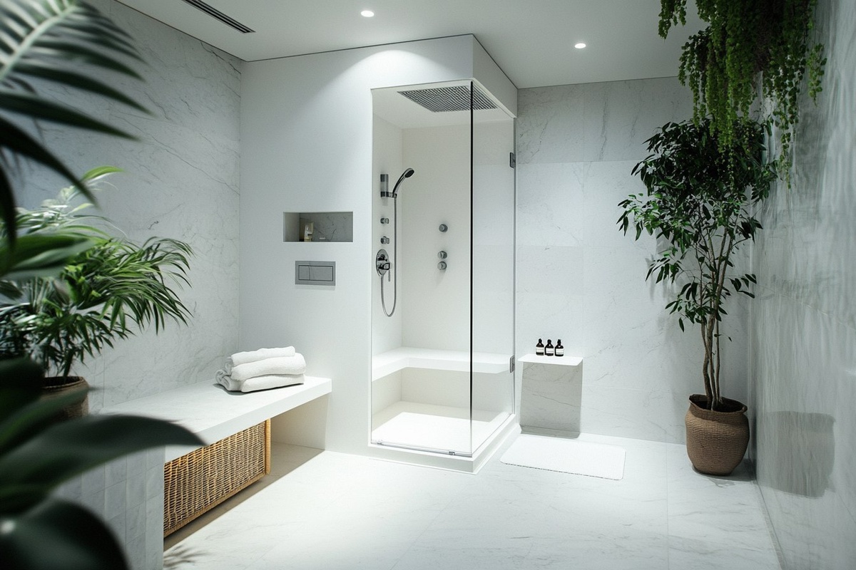 Создано на основе запроса: steam room in the corner of a bathroom, in a white style with ceramic and marble bathroom