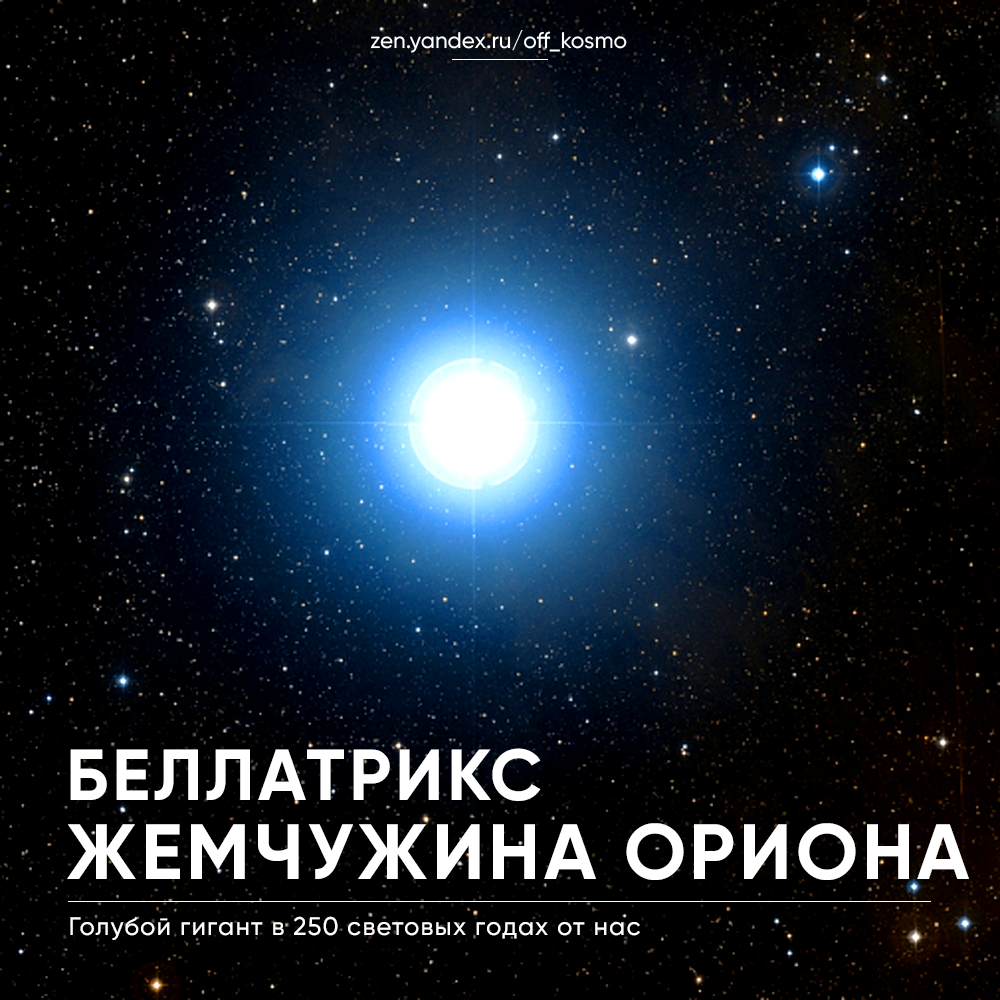 На расстоянии примерно 250 световых лет от Земли, в крупном и хорошо заметном на небе созвездии Ориона, расположена яркая голубоватая звезда. Она известна как Гамма Ориона, а также имеет собственное имя – Беллатрикс. Именно в честь этой звезды была названа Беллатрисса Лестрейндж из вселенной «Гарри Поттера». В своем созвездии данное светило является третьим по яркости, уступая лишь Бетельгейзе и Ригелю. Беллатрикс – раскаленный голубой гигант, в 8,6 раза массивнее Солнца, а его радиус в 6,4 раза больше, чем у нашего светила. Температура поверхности данной звезды превышает 22000 К, и это означает, что пик ее светимости приходится на ультрафиолетовую часть спектра. Нам же Гамма Ориона видна как сияющая голубая точка. Она испускает в 7400 раз больше энергии, чем наше Солнце и занимает 26 место в списке самых ярких звезд ночного небосвода. Как и все массивные горячие светила, Беллатрикс недолговечна. Она появилась на свет примерно 25 млн лет назад и уже прошла большую часть своего жизн