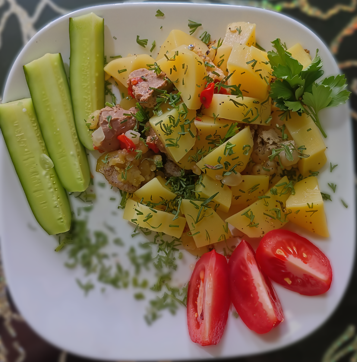 (можно и томатную пасту) 💧 бульон или вода — около 300 мл 🧂🌶️ лавровый лист, перец, соль — по вкусу 🛢️ растительное масло — для жарки 🌶️ болгарский перец — 1 шт. Приготовление: Мясо нарезать на кусочки и обжарить на масле в сковородке. Лук и солёные огурцы нарезать тонкой соломкой. Помидоры и болгарский перец нарезать средним кубиком. Добавить все нарезанные ингредиенты к мясу и перемешать. Добавить соль и сухие специи. Залить мясо с овощами горячей водой, чтобы она полностью покрыла его и оставить тушиться на 40-45 минут. Всё зависит от того какое мясо у в