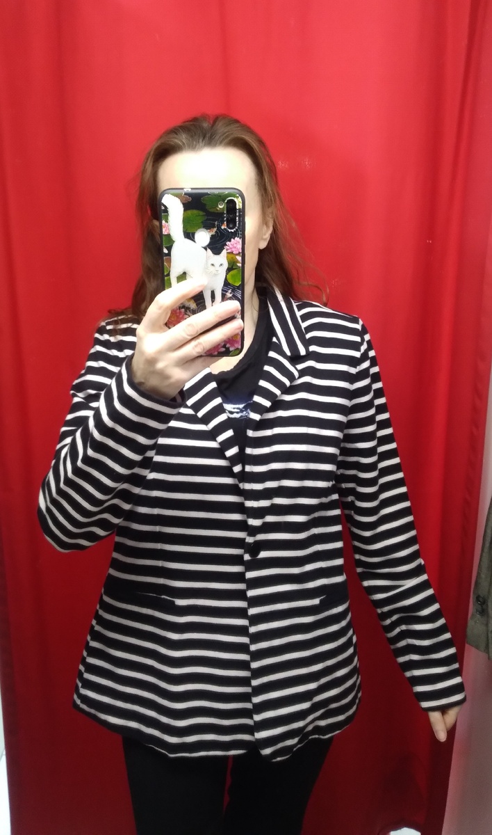 Здравствуйте, кажется наша квартира превращается в остров невезения. Совсем недавно была катастрофа с сантехникой на кухне, тогда кран на старость лет решил, что он фонтан и полил из всех щелей. Пока снимали кран разорвалась гофрированная труба, видимо для полноты ощущений. А на днях муж потянул кастрюлю из холодильника и у неё отвалилась ручка((. Все шмякнулось по закону подлости, гречка живописно раскинулась по кухне. Вроде пустяк, но обидно, хотя хорошо, что не суп)). А сейчас я веду мучительную переписку с mail, напутала с паролями и меня не пускают, пытаюсь доказать, что я это я. Нет у них удобного подтверждения по телефону((. А ещё ранее на даче обнаружились мыши, теперь переживаю, муж на дачу собирается, а мыши не выгонят его, домой то пустят? И каждую неделю какая-то ерундовина случается(( Обзор из секонда, цена 590 за кг. Полосатый жакет без подкладки сойдет на небольшую прохладу. 95% хлопка. Мягкое трикотажное полотно, вещь уютная, но не теплая. Платье скорее всего надо носи