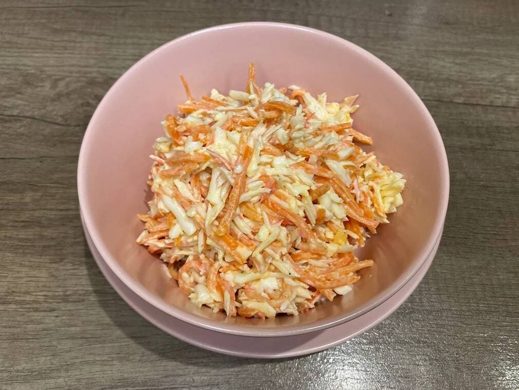 Недавно наткнулась в просторах интернета на интересный рецепт. Так как я люблю крабовый, но он немного поднадоел уже, решила поискать альтернативу. Ингредиенты очень простые: Я особо не придерживалась рецепту и делала на глаз, так как я люблю морковку, добавила немного больше. А ещё по итогу я добавила маленькую банку кукурузы, но и без неё будет вкусно. 1. Крабовые палочки нужно нарезать соломкой или ломтиками, переложить в салатник или глубокую миску. 2. Плавленый сырок и яйца натереть на крупной тёрке. 3. В салатник выложить морковь по-корейски и все подготовленные ингредиенты. 4. Добавить майонез, соль, перец по вкусу, а затем тщательно перемешать. По желанию можно добавить рубленую зелень, например, укроп, петрушку или зелёный лук. Салат получился нежнейшим, очень вкусный, обязательно попробуйте. Приятного аппетита!