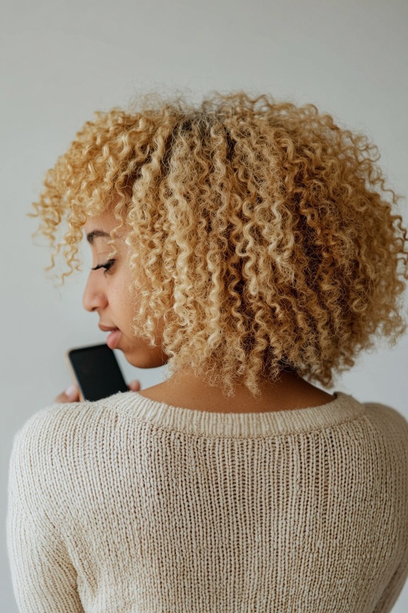 Создано на основе запроса: back angle, mixed race woman, curly blonde hair, looking down at phone , real photography