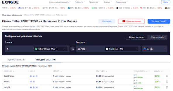 Сейчас всё можно сделать в течение часа — достаточно найти надёжный обменник крипты в Москве, работающий с наличными или по переводу. Чтобы упростить выбор, используйте сервис Exnode — агрегатор, который подбирает лучшие предложения по курсу, формату и местоположению.