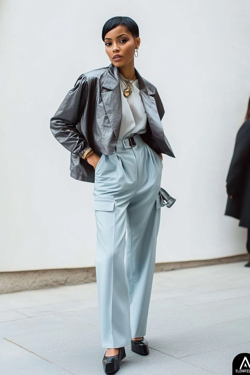 Автоперевод: стоящая черная модель в светло -голубых брюках, жесткой ткани, мешковатых брюках фенминина, шелковистой ткани и серым укороченным куртке, у нее короткая стрижка Pixie, светлая кожа, современная, модная, белая студийная стрельба Bckground Studio Shootio