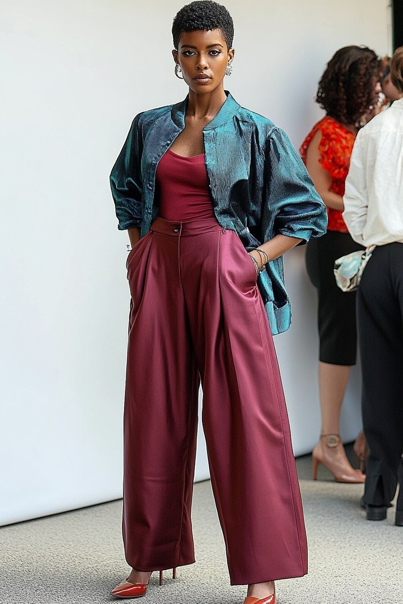 Создано на основе запроса: standing black model wearing maroon pants, stiff fabric, tomboyish baggy fenminine trousers, , silky fabric, and blue red green jacket, she has short pixie haircut, light skinned, modern, trendy, white bckground studio shoot