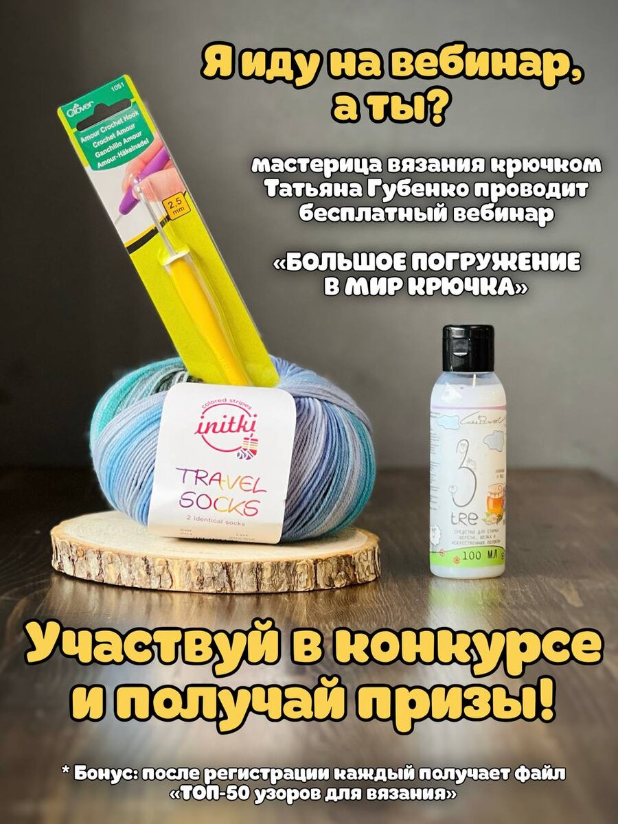 🔥Хотите выиграть крутые призы и узнать всё о вязании крючком? Тогда участвуйте в нашем конкурсе!🔥 Победитель получит в качестве приза 1 набор «Магия вязания от iNitki»✨ Состав набора: - Carewool TRE средство для повседневной стирки изделий из пряжи лаванда и мёд 100 мл - Крючок для вязания Clover Amour 2.5 мм 1051 - 1 моток пряжи Travel Socks iNitki - 1000 бонусных баллов на личный счет GetCourse iNitki, которые можно потратить на любые продукты Школы Вязания *на любые продукты Школы Вязания, кроме курса «Базовый крючок», баллы будут начислены в течение 2-х дней с момента регистрации на сайте GetCourse ➡️ Конкурс проходит на двух площадках: - Вконтакте - Запретграм Даты конкурса: - Старт: 12.04.2025 - Окончание и итоги: 24.04.2025 в 12:00 МСК Условия прописаны под постами в соцсетях, переходите по ссылкам выше, читайте условия и участвуйте! 🎁 Бонус: Каждый участник, который зарегистрируется на вебинар «Большое погружение в мир крючка» (14.04 в 18:00 МСК), получит бесплатный ф