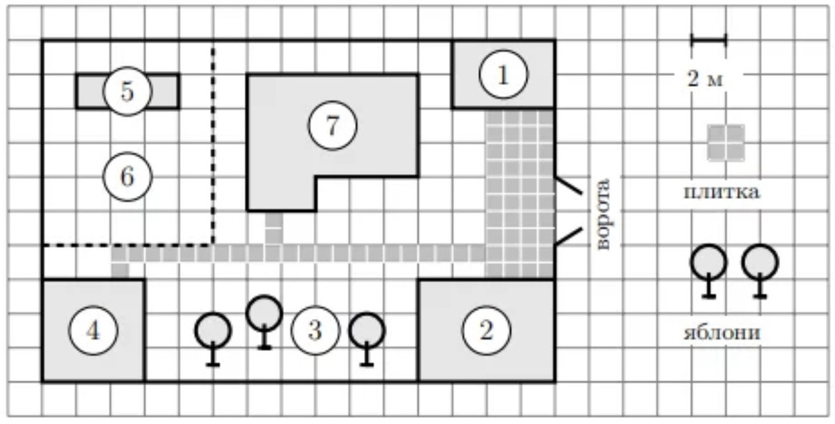 Прочитайте внимательно текст и выполните задания. Все ответы публикуем здесь👉 На плане изображён дачный участок по адресу: п. Сосновка, ул. Зелёная, д. 19 (сторона каждой клетки на плане равна 2 м). Участок имеет прямоугольную форму. Выезд и въезд осуществляются через единственные ворота. При входе на участок слева от ворот находится гараж. Справа от ворот находится сарай площадью 24 кв. м, а чуть подальше — жилой дом. Напротив жилого дома расположены яблоневые посадки. Также на участке есть баня, к которой ведёт дорожка, выложенная плиткой, и огород с теплицей внутри (огород отмечен на плане цифрой 6). Все дорожки внутри участка имеют ширину 1 м и вымощены тротуарной плиткой размером 1 м × 1 м. Между гаражом и сараем находится площадка, вымощенная такой же плиткой. К участку подведено электричество. Имеется магистральное газоснабжение. ЗАДАНИЕ 1. Для объектов, указанных в таблице, определите, какими цифрами они обозначены на плане. Заполните таблицу, в бланк ответов перенесите п
