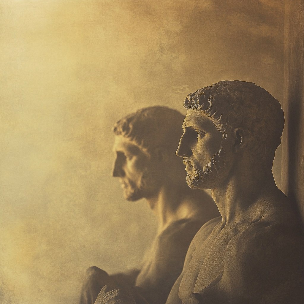 Создано на основе запроса: image of greek male statues in a minimal atmospheric combo, fine art photography, golden tones