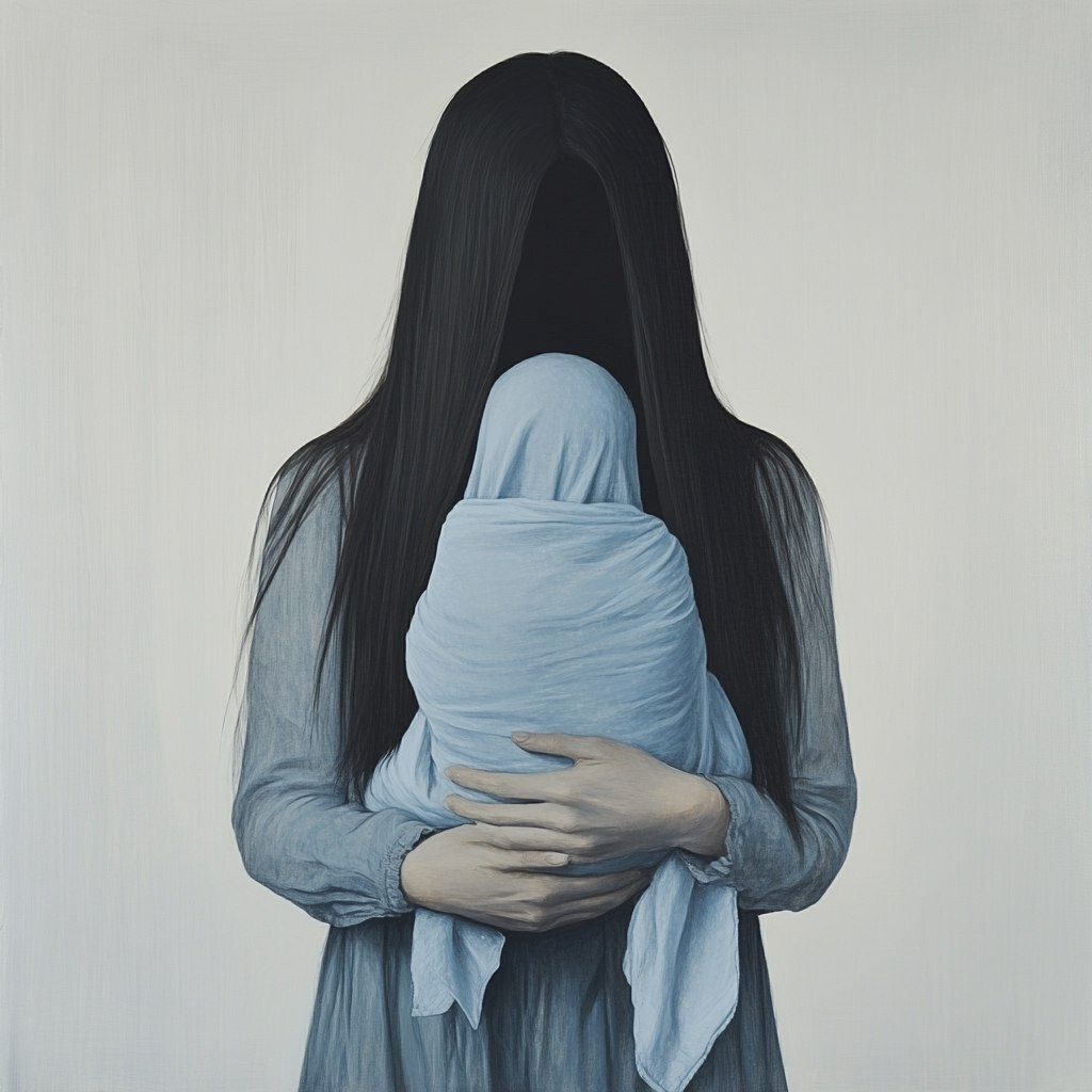 Создано на основе запроса: Create an oil painting of a faceless woman with long dark straight hair holding an infant wrapped in a baby blue