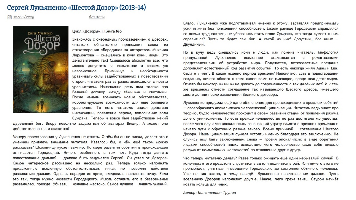Сергей Лукьяненко «Шестой Дозор» Критика