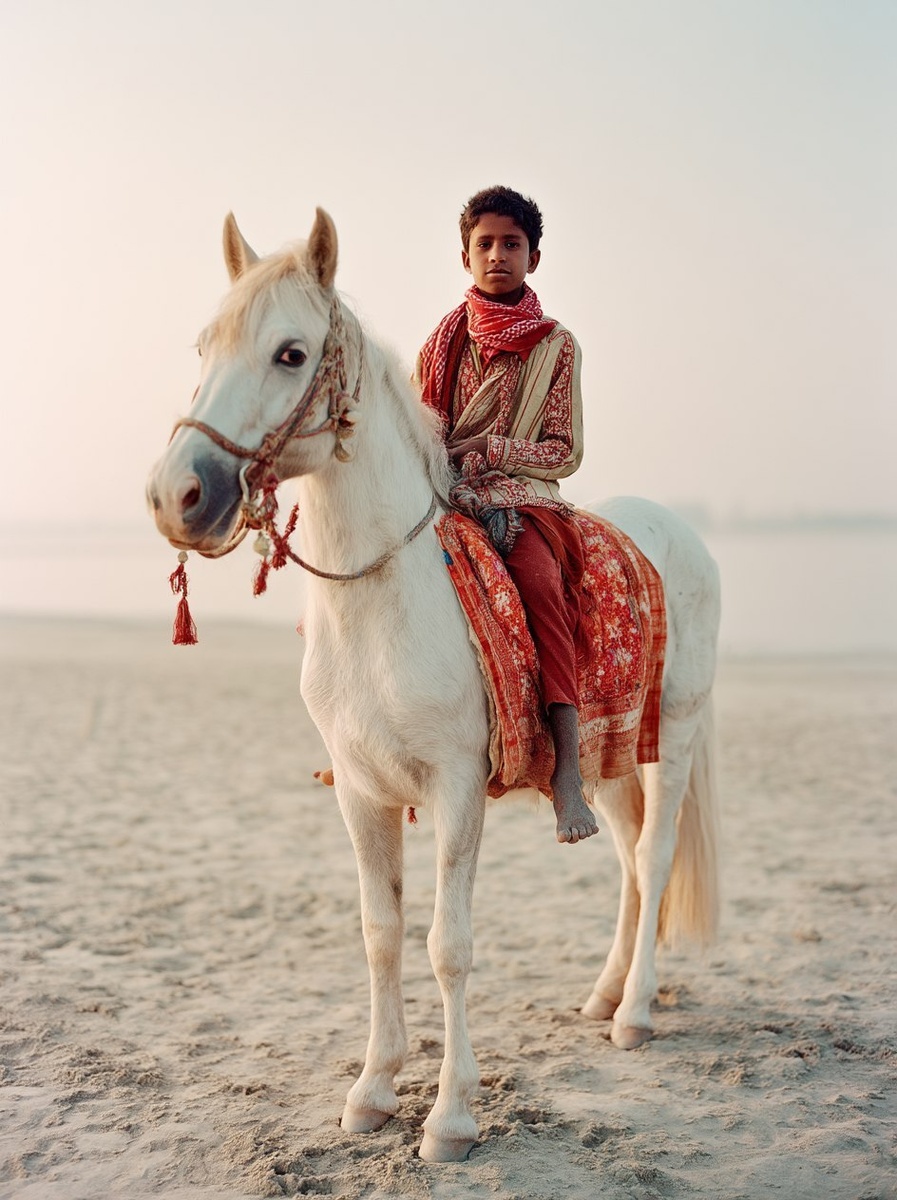 Создано на основе запроса: A young Indian boy sitting on top of his white horse with red and orange cloth. The horse is wearing an Arabian-style silk scarf around its neck. In front of him, there's empty sea sand and soft light. Photographed in the style of Martin Parr and Martha Cooper, this is a work of documentary photography.