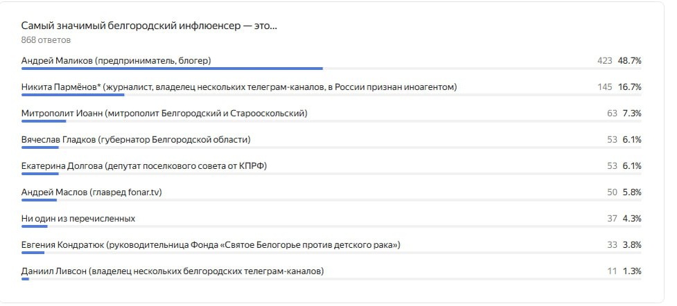 Готовы узнать имя главного белгородского инфлюенсера по версии наших подписчиков? Редакция «Фонаря» подвела итоги опроса, с помощью которого определяла самого значимого белгородского инфлюенсера. В опросе поучаствовали более 860 раз. Желающие могли отдать свои голоса за восьмерых кандидатов. И вот каким образом распределились голоса. Совпали ли ваши ожидания с реальностью👍 или нет👎