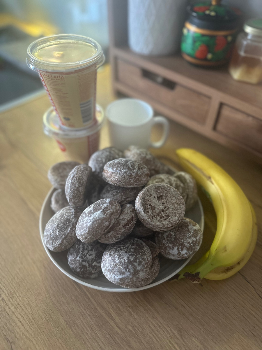 Ингредиенты: Шоколадные пряники -500гр, надо брать очень свежие! Сметана 20 % - 600 гр. Сахарная пудра -70гр.. Банан-2-4 шт. (или можно заменить на что вам больше хочется ) Берем салатницу, застилаем ее плёнкой, но так, чтоб оставался еще запас, чтоб сверху накрыть тортик. Делим пряники на пополам, сметану перемешиваем с сахарной пудрой. Банан режим кружочками 2-3 мм. Выкладываем слой пряников, сверху смазываем обильно кремом, далее бананы, потом снова слой пряников , крем, бананы, я стараюсь еще немного прижимать, можно обваливать пряники в крему , а потом выкладывать кому как удобно. Бананы выкладываете тоже как вам больше нравится, я выкладываю хаотично, не полностью делаю слой, а вам как больше нравится, поэтому у меня ушло два банана. И так когда все выложили сверху накрываем пленкой (хвостики которые мы оставили). Пусть торт постоит в тепле час, а потом убираем в холодильник минимум на 5 часов. После того как он у нас отстоялся в холодильнике, подготовим блюдо для то