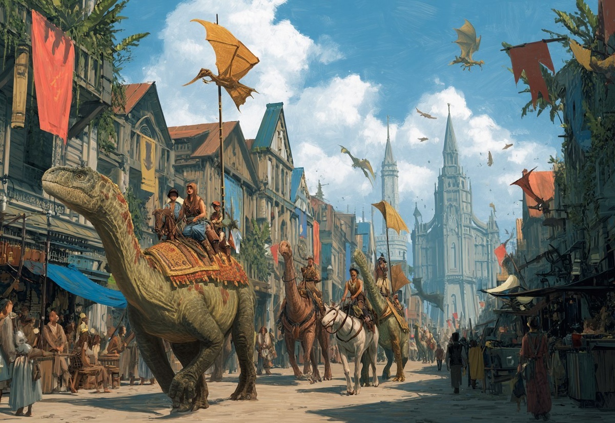 Создано на основе запроса: Illustration of a street on distant land Nibiru. People riding giant creatures such as giant moas and giant dinosaurs with flags and medieval streets with stalls and stone buildings in the background, in the style of Craig Mullins and James Gurney. --- Автоперевод: Иллюстрация улицы на далекой земле Нибиру. Необычно выглядит? 🤔 https://dzen.ru/id/65c0c65c86e4f837c27b24d7 #ИИ #AI #нейросеть #midjourney #art