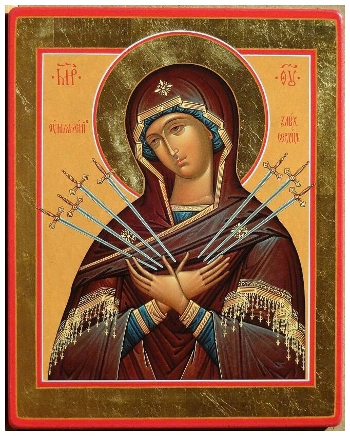 Перед вами образ Божией Матери "Семистрельная". Умилительная икона. Матерь Божия стоит со сложенными на груди руками, а сердце Её пронзают семь стрел. Эти стрелы - не что иное, как наши с вами грехи.