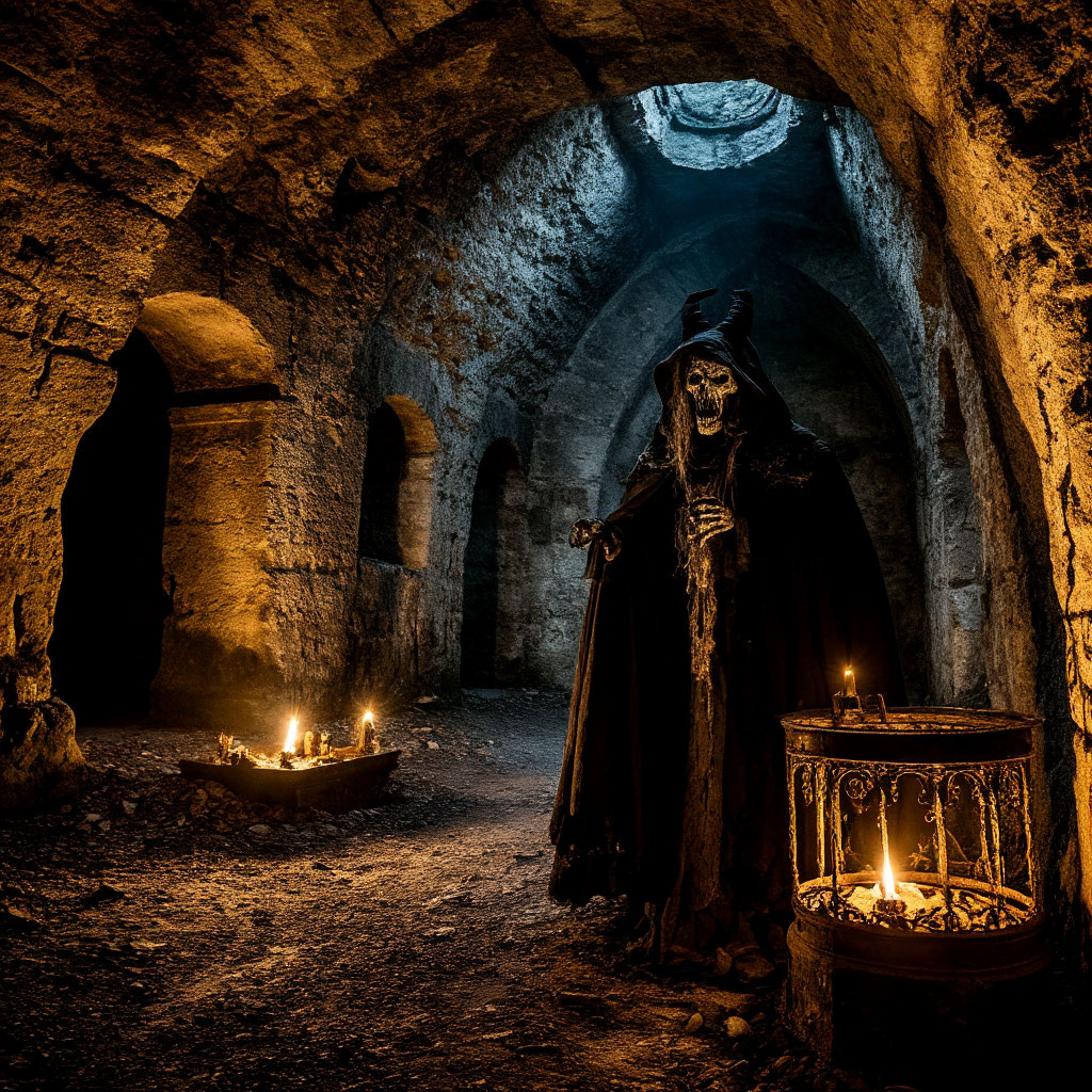 Глава 1: Карта алхимика. Группа студентов-историков — Лиза, Поль и Клара — нашла в архивах Сорбонны манускрипт XVI века с пометкой «Путь к Философскому Камню». На пергаменте была схема катакомб с отметкой: «Там, где кости поют». Ночью они спустились в запретную зону, отмеченную красным крестом. Воздух гудел, словно под землёй билось гигантское сердце. Глава 2: Кричащие стены. В тоннеле, которого не было на современных картах, стены были выложены черепами с выжженными символами. «Это не обычные катакомбы… это алтарь», — прошептала Клара. Внезапно черепа начали шептать на латыни: «Sanguis pro sanguine» (Кровь за кровь). Поль заметил, что символы светятся — они вели к заваленной арке. За ней — комната с каменным столом, покрытым чёрным кристаллом. Глава 3: Камень и жертва. На столе лежал дневник алхимика Жиля де Рэ: «Камень требует жизни. Он открывает дверь, но выпускает ТЕНЬ». Лиза коснулась кристалла — по катакомбам прокатился рёв. Камни задрожали, а из трещин выползли чёрн