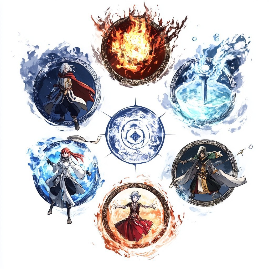 Создано на основе запроса: Fantasy concept illustration, Symbol, Circle of alchemical elements, Fire at the top, Earth at the bottom, Water on the left, Air on the right, High quality