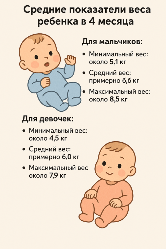 Вес ребенка в 4 месяца является важным показателем его развития, но не единственным. Ориентируйтесь на средние нормы, но главное – наблюдайте за динамикой прибавки веса и общим состоянием вашего малыша. При любых сомнениях обращайтесь к педиатру.