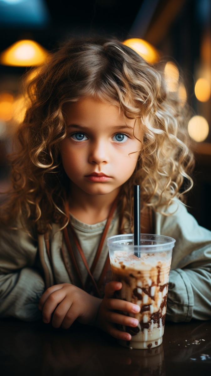 Создано на основе запроса: a little adopted girl looking sadly at her stepsister happily drinking a milkshake in a restaurant, contrast in