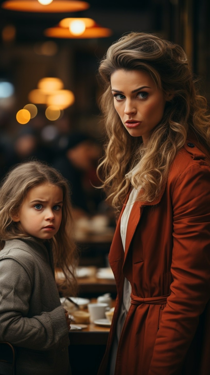Создано на основе запроса: a kind woman confronting a mother at a restaurant, asking about the unfair treatment of a child, tense but calm