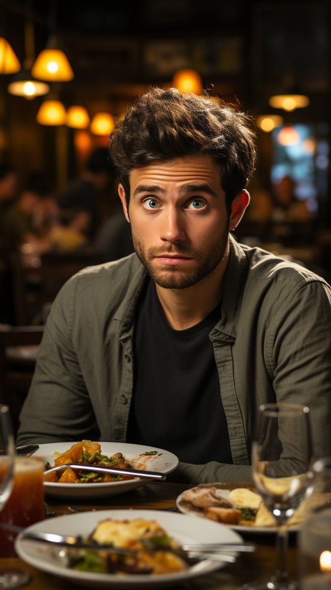 Создано на основе запроса: a kind stranger overhearing a heated argument at a restaurant table, shocked and concerned expression