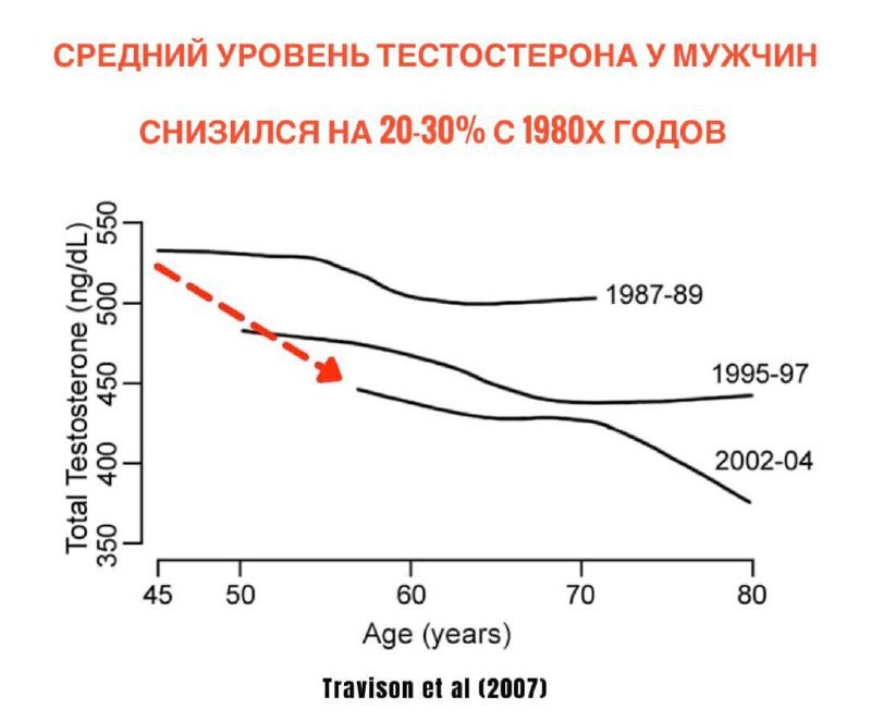 Сегодня хочу рассказать про проблему падения тестостерона у мужчин. По сравнению с 80-ми годами 20 века уровень тестостерона в среднем упал на 25%!((Journal of Clinical Endocrinology & Metabolism, 2022) Не для никого не секрет, что тестостерон после 30 лет снижается на 1-2% Однако, по многочисленным исследованиям, уровень тестостерона у 25-летнего человека оказался такой же, как у 40 летнего мужчины, который жил в 80-х годах 20 века