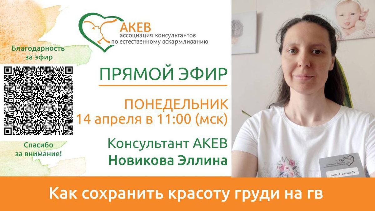 ⚡Внимание! Новый эфир! Новикова Эллина Борисовна, консультант по грудному вскармливанию и введению прикорма, психолог, член АКЕВ с 2006 года предлагает обсудить животрепещущую тему : «Как сохранить красоту груди в период грудного вскармливания?» ⏰14 апреля в 11.00 (мск), понедельник Место проведения - в ВКонтакте АКЕВ https://vk.com/akev_info 1. Разберёмся, как и когда происходят изменения молочной железы. 2. Обсудим возможные проблемы: появление растяжек на коже и потеря привлекательной формы груди. 3. Уделим особое внимание профилактике этих проблем в период беременности и грудного вскармливания. Интересно? До встречи в эфире.