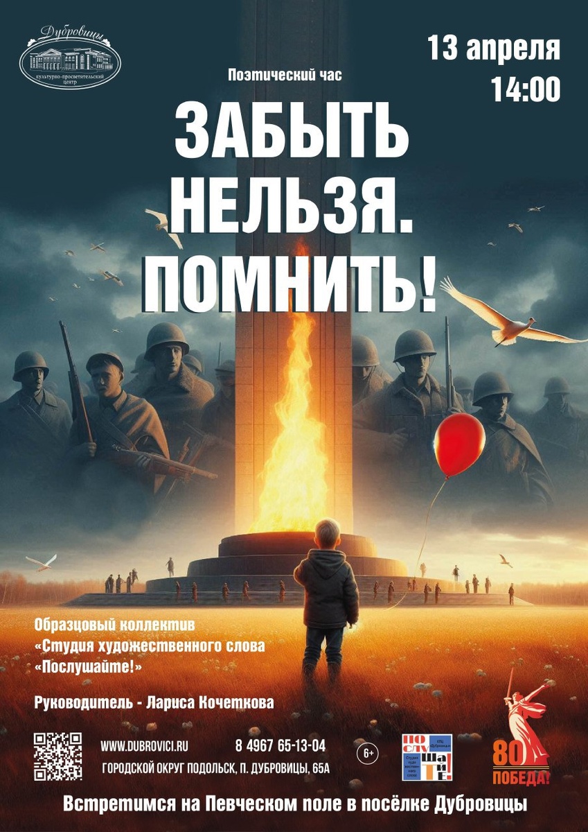 ✨ Поэтический час «Забыть нельзя. Помнить!» ⭐️ 80-летию Великой Победы посвящается! 🎶Образцовый коллектив «Студия художественного слова «Послушайте» 📓В программе литературные произведения российских авторов. На Певческом поле посёлка Дубровицы ⏳ Продолжительность – 1 час 🚫 Возраст: 6+ 📆 13.04.2025 🕒 14:00 🏢 Культурно-просветительский центр "Дубровицы" 📍 г.о. Подольск, поселок Дубровицы, д. 65А 💰 Вход свободный❗️ #webПодольск ✅ Мероприятия Подольск https://dzen.ru/id/66ed500f7b5671493eca3fd6 http://vk.com/podolsk_events http://dzen.ru/podolsk_events